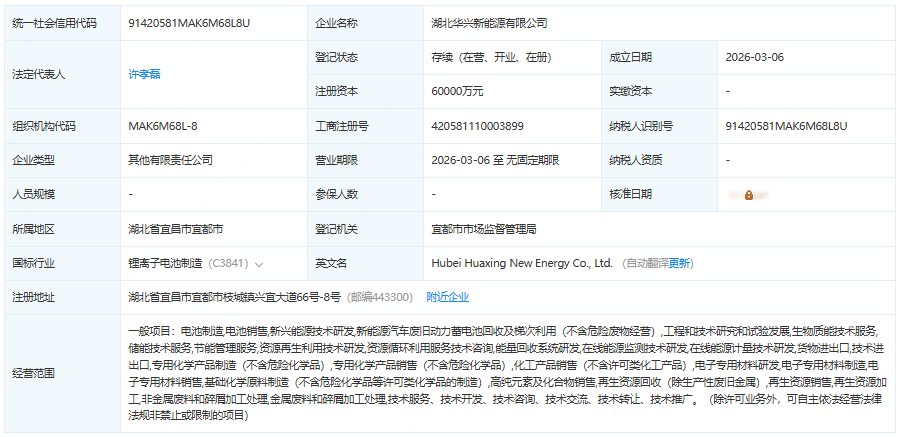 注册资本6亿!聚焦电池业务,万华化学与兴发集团合资设立新公司企查查信息显示,近日,万华化学与兴发集团在湖北省宜昌市宜都市联合设立湖北华兴新能源有限公司。该公司成立于3月6日,法定代表人为许孝磊,注册资本达60000万元人民币。注册地址位于宜