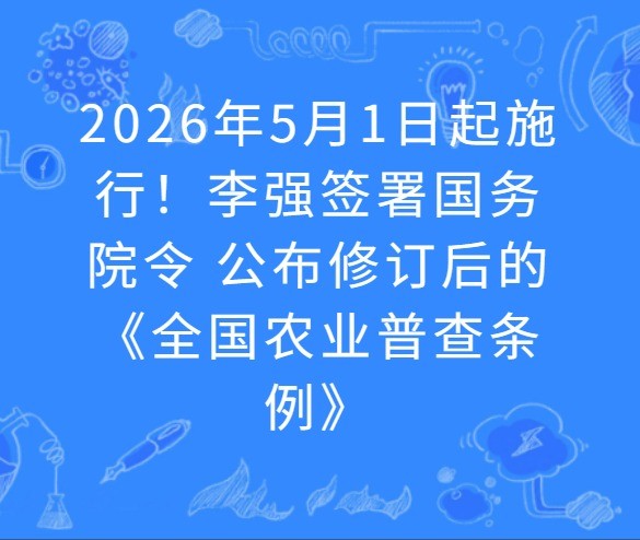 国务院总理李强日前签署国务院令,公布修订后的《全国农业普查条例》(以下简称《条例》),自2026年5月1日起施行。《条例》共7章44条,修订的主要内容如下。 一是完善农业普查基础制度。增加“各方共同参与”作为农业普查组织实施原则。增加乡村产业发展、乡村建设、乡村治理等事项作为农业普查内容。增加遥感测量等新普查方法,明确农业普查应当充分利用行政记录、社会大数据等资料。 二是加强数据质量控制和资料