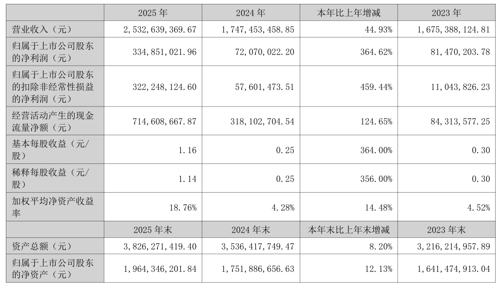 长芯博创公布2025年年度报告,报告期内,公司实现营业收入25.33亿元,同比增长44.93%,其中境内销售收入10.27亿元,占营业收入的40.56%;境外销售收入15.05亿元,占营业收入的59.44%。归属于上市公司股东的净利润3.35亿元,同比增长364.62%。向全体股东每10股派发现金红利2.90元。