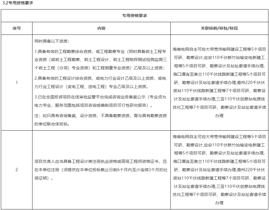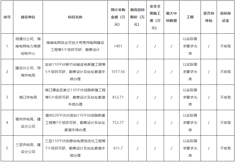 2.2.1项目概况:对海南电网有限责任公司“十五五”高压配电网规划库中通过前期决策的项目,进行可研、勘察设计及站址廊道手续办理的专项招标,共设置5个标段,包含29个主网建设项目。