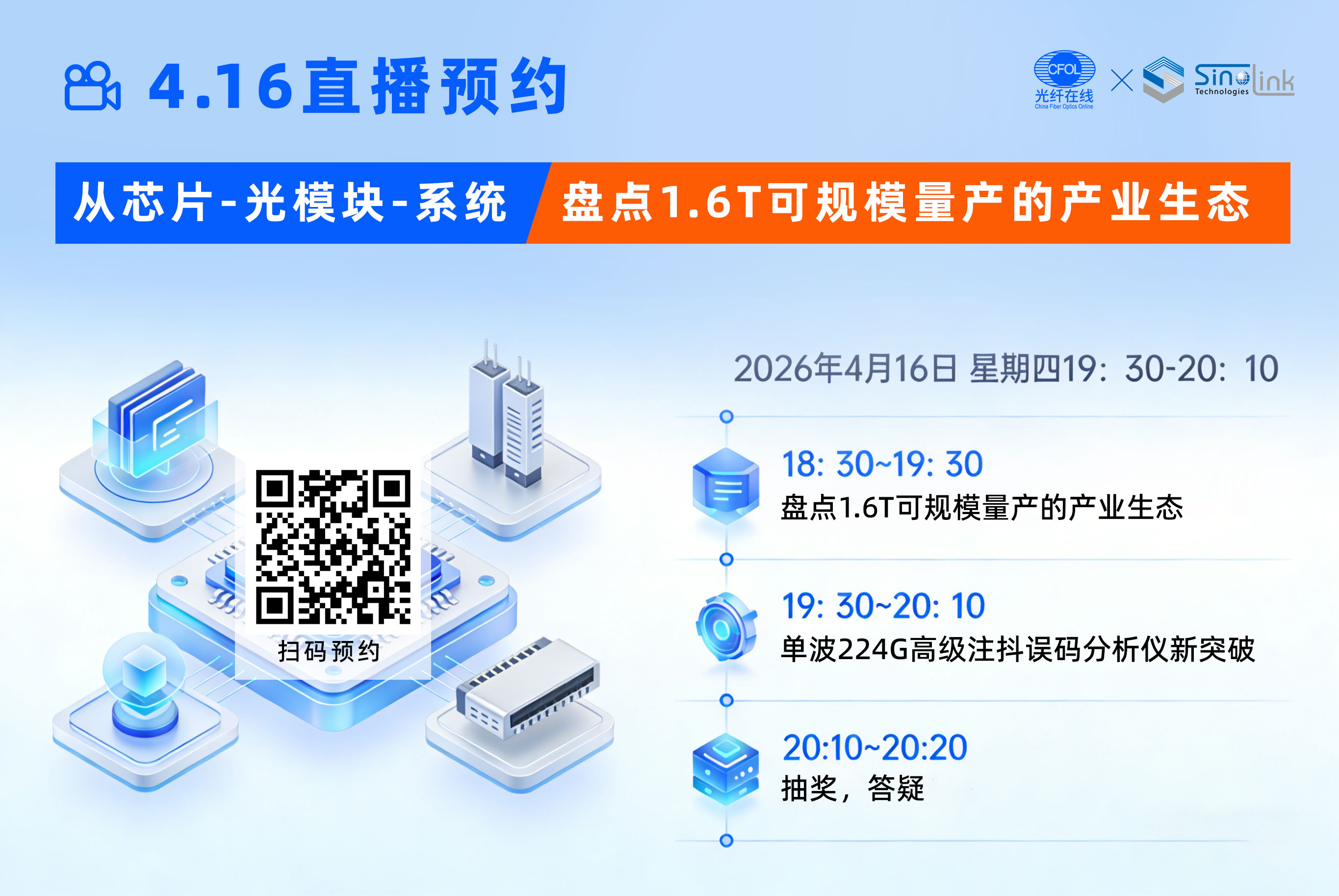 4月16日(周四)18:00-20:00,光纤在线将带来一场不容错过的加播专场。我们首次系统梳理从芯片、光模块到系统应用的完整1.6T产业链,并邀请产业链企业现场分享测试环节的最新突破。