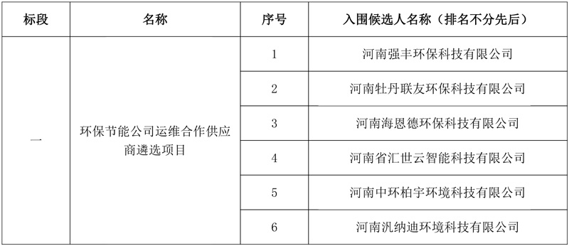 河南中平招标有限公司受中国平煤神马控股集团有限公司招标采购中心的委托,对环保节能公司运维合作供应商遴选项目进行公开招标,按规定程序进行了公告、开标、评标,经过评标委员会的评审,现对入围候选人公示如下: