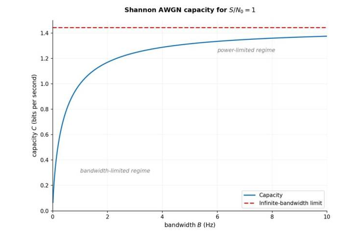 图二:香农AWGN容量与带宽的关系突出了从带宽受限到功率受限区域的转变。随着带宽增加,每赫兹的信噪比下降,导致容量渐近地趋近于一个固定极限。这种权衡关系描述了扩展高速芯片到芯片和光互连时所面临的挑战。