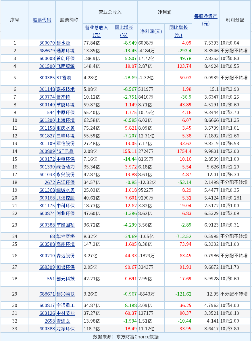 3月以来,A股上市公司陆续披露2025年年度报告。根据东方财富Choice数据,环保行业目前已有33家企业公布,其中25家实现净利润同比增长、8家同比下降,行业盈利结构呈现出明显的分化态势。详情如下(如有错漏,欢迎指正补充)↓