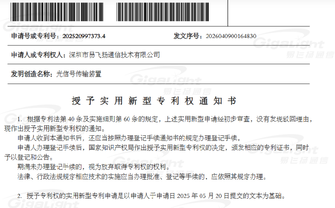 即日从知识产权局获悉,易飞扬(GIGALIGHT)于2025年5月提交的一种外置光源的800G/1.6T/3.2T可插拔硅光模块获得实用新型专利授权,发明专利权利处于实审中。