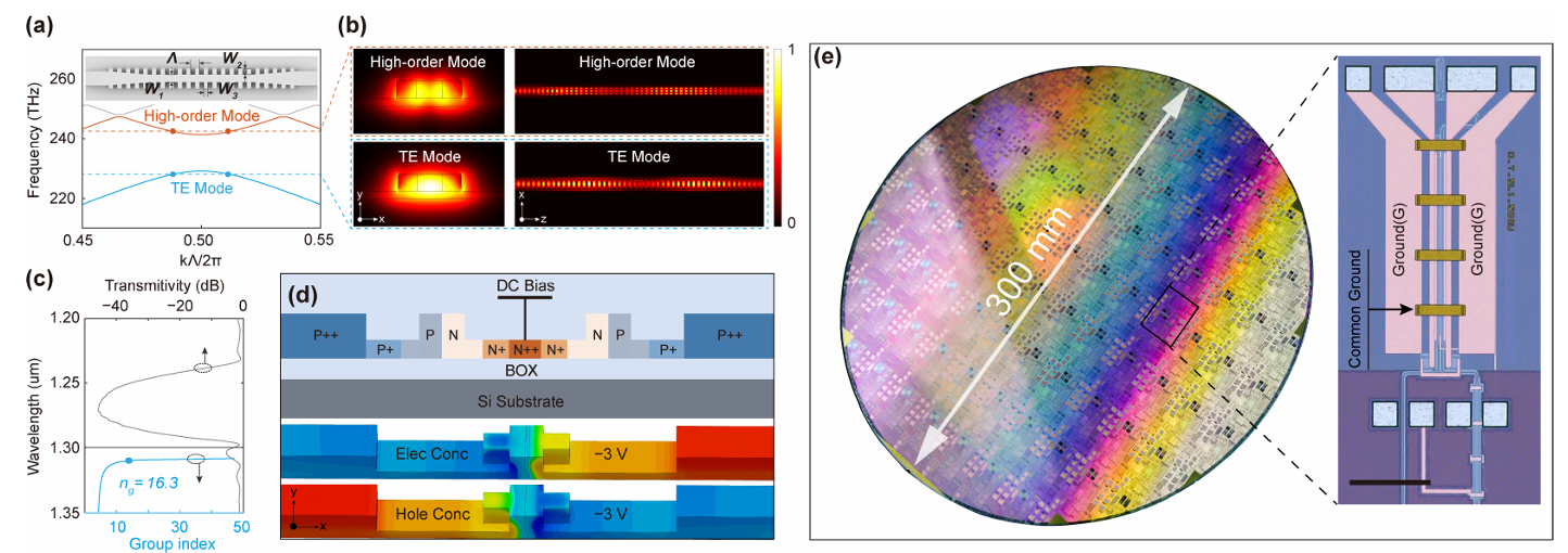 图1:慢光调制器的完整设计架构,包括光子能带曲线、TE模式的电场分布、1310nm波长处的群折射率特性、具有掺杂分布的横向p-n二极管相移器截面图,以及制造完成的300mmSOI晶圆和调制器器件的照片。基于慢光技术的紧凑型调制器