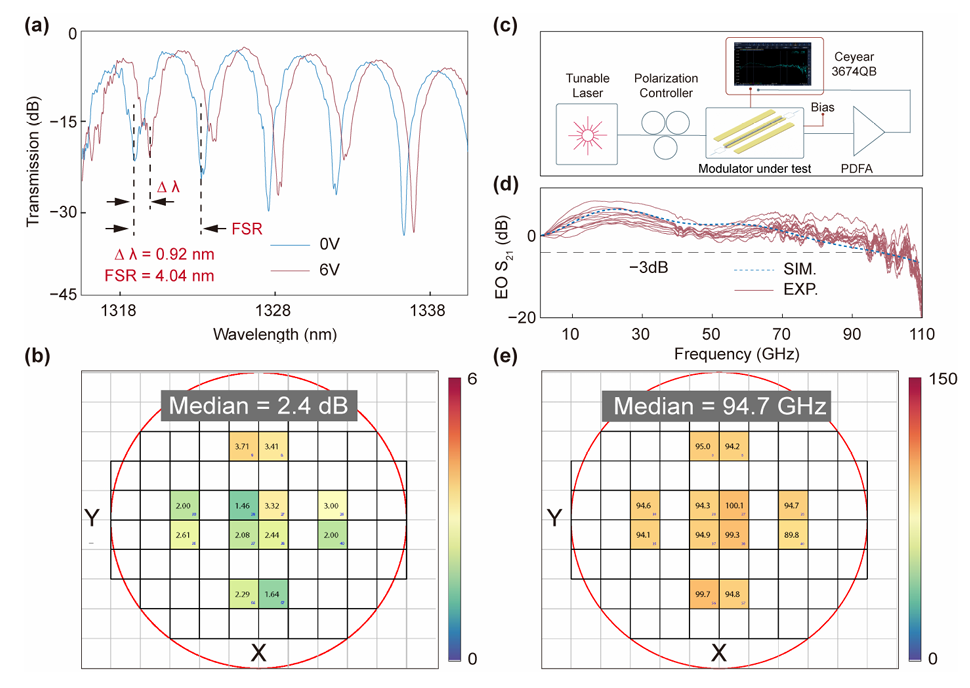 图2:全面的表征结果,包括显示插入损耗性能的静态透射谱、展示整个晶圆2.4dB中位插入损耗的晶圆级测量统计数据、电光带宽测试的实验装置示意图、测量的电光S21频率响应曲线,以及显示优异均匀性的晶圆级3dB带宽测量分布(中位值为94.7GHz)。多项指标的卓越性能