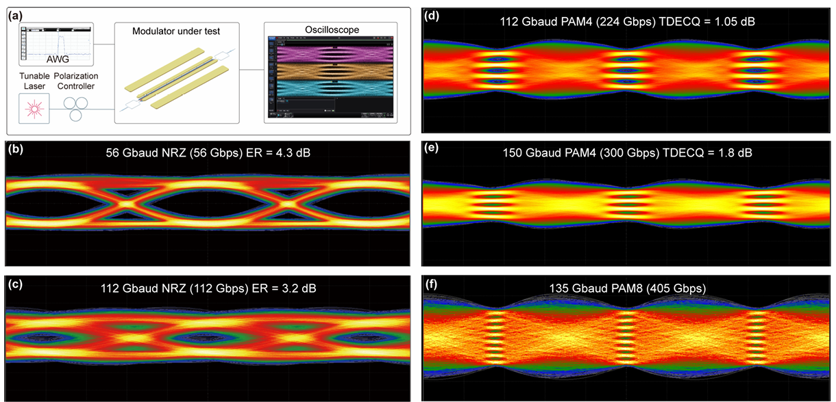大信号表征采用256GSa/s任意波形发生器,以2.7Vpp的射频信号驱动调制器。输出光信号通过镨掺杂光纤放大器放大,并使用宽带示波器检测。对于非归零开关键控调制格式,器件在56GBaud下生成了清晰的眼图,消光比为4.3dB,在112GBaud下消光比为3.2dB。