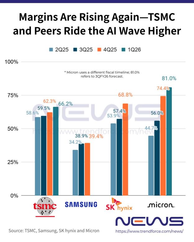 台积电在第一季度录得净利润新高后,管理层预计2026年第二季度营收将在390亿美元至402亿美元之间,同比增长约32%,环比增长约10%。在盈利能力方面,假设汇率为1美元兑31.7新台币,公司预计毛利率将在65.5%至67.5%之间,营业利润率预计在56.5%至58.5%之间。