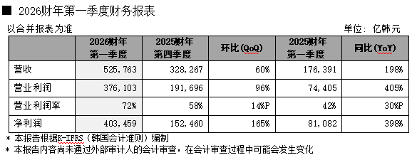 2026年4月23日,SK海力士发布截至2026年3月31日的2026财年第一季度财务报告。公司2026财年第一季度营业收入为52.5763万亿韩元,营业利润为37.6103万亿韩元,净利润为40.3459万亿韩元。2026财年第一季度营业利润率为72%,净利润率为77%。(K-IFRS为准)