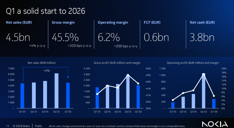 近日,诺基亚公布2026年第一季度财报,2026年实现稳健开局,营收同比增长4%(按恒定汇率和投资组合计算),一季度营收44.97亿欧元,同比增长2%。可比毛利率扩大320个基点至45.5%,可比营业利润率提升200个基点至6.2%,AI与云客户净销售额同比增长49%,该季度AI与云订单额达10亿欧元。