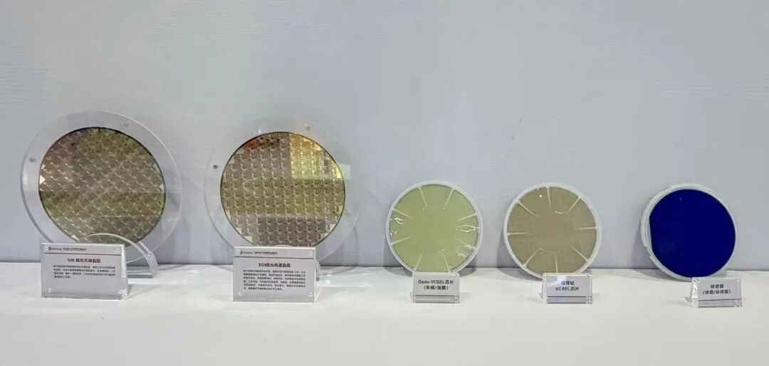 SiN硅光无源晶圆、SOI硅光有源晶圆、GaAsVCESL芯片(车规/消费)、可寻址VCSEL芯片、硅透镜(球面/非球)、EEL(边发射激光器)六大核心晶圆样品集中亮相,全面展现了双平台的技术突破与产业化成果。