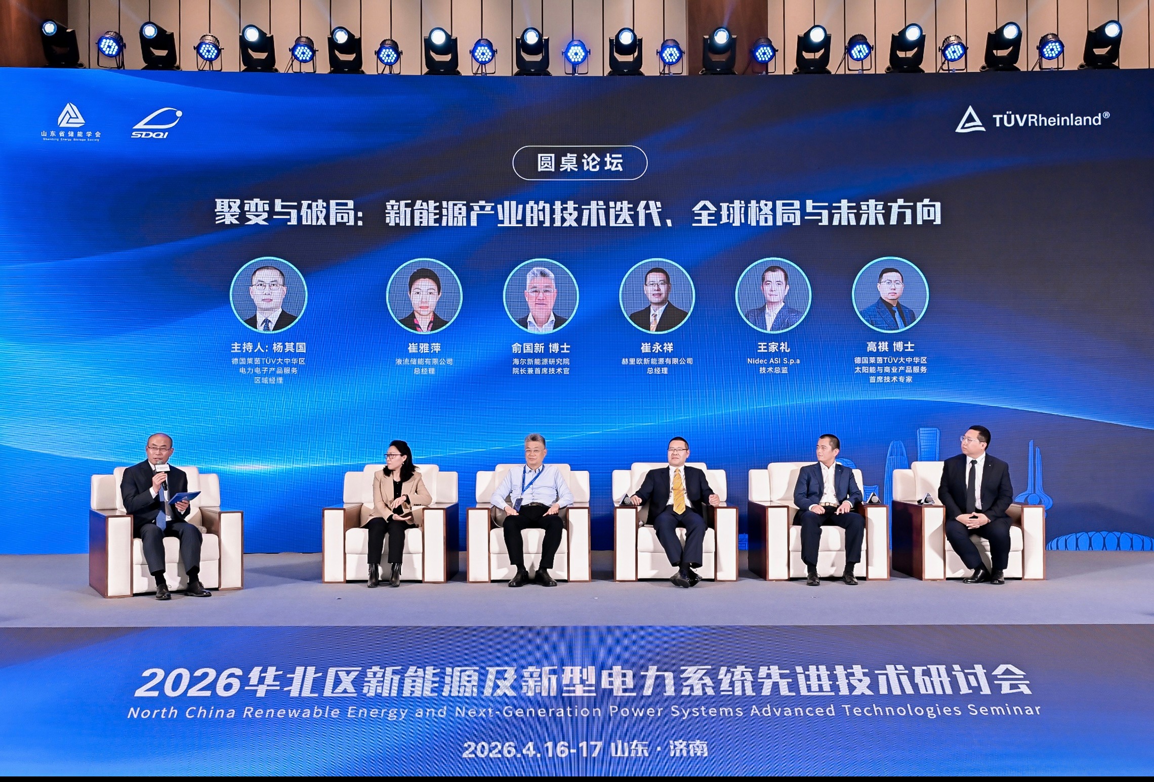 4月16日~17日,由TÜV莱茵大中华区、山东省产品质量检验研究院、山东省储能学会联合主办的2026华北区新能源及新型电力系统先进技术研讨会在济南召开,会议围绕光伏、储能、氢能、充换电等新能源领域前沿技术及热点问题展开研讨,共同为促进新能源产业高质量发展贡献智慧和力量。