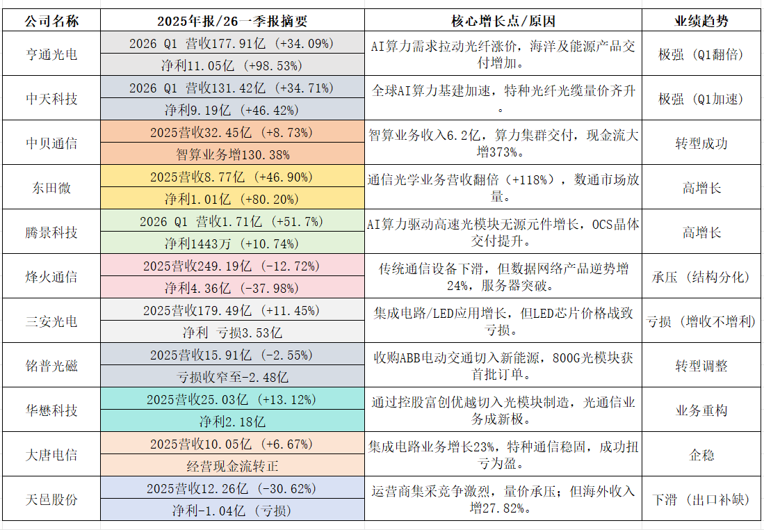 东田微与腾景科技作为上游元器件厂商,业绩弹性最大。东田微的通信光学业务营收增长118%,腾景科技一季度营收增长51.7%,均直接归因于AI算力对高速光模块及无源元件的需求。