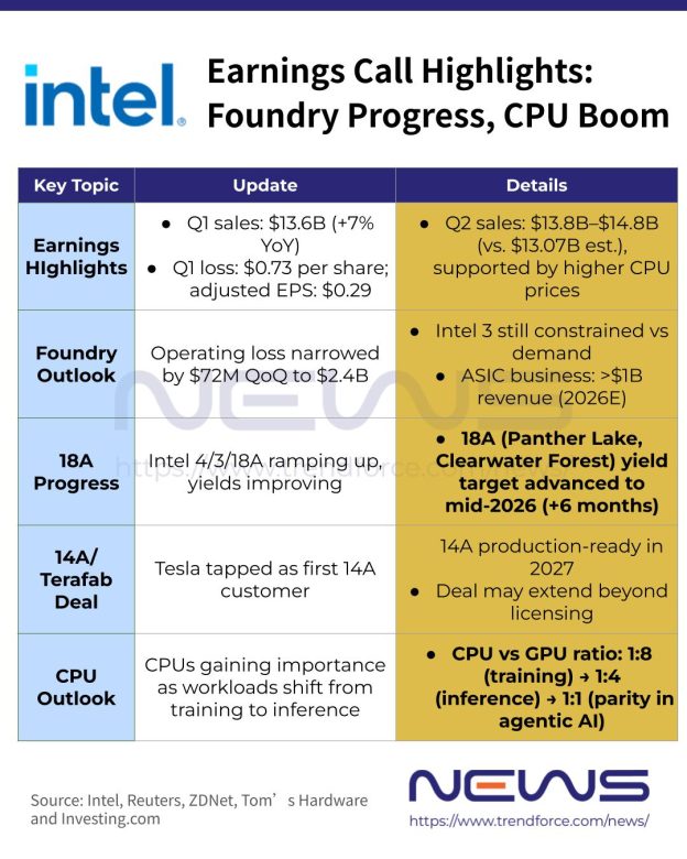 代工业务方面,英特尔持续推进扭亏进程。一季度受超40亿美元重组费用影响,每股出现亏损;剔除特殊项目后实现盈利,大幅优于市场预期。一季度英特尔代工业务营收同比增长16%至54亿美元,受产线扩建投入拖累仍存在营业亏损,同步推进马来西亚槟城封测产能扩张,新增订单预计自2027年逐步释放收益。