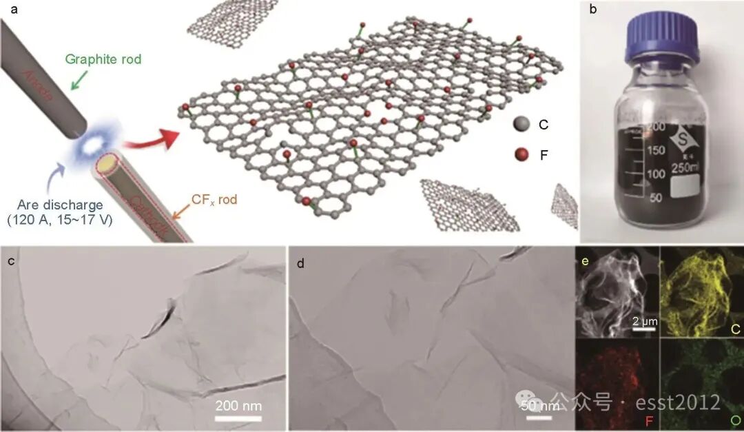图3 (a) F-改性石墨烯形成过程的示意图;(b) 通过电弧充电法制备的F-改性石墨烯粉末的数字照片;(c)~(d) F-改性石墨烯的透射电镜图像;(e) STEM图像及其相应的EDX元素映射图像