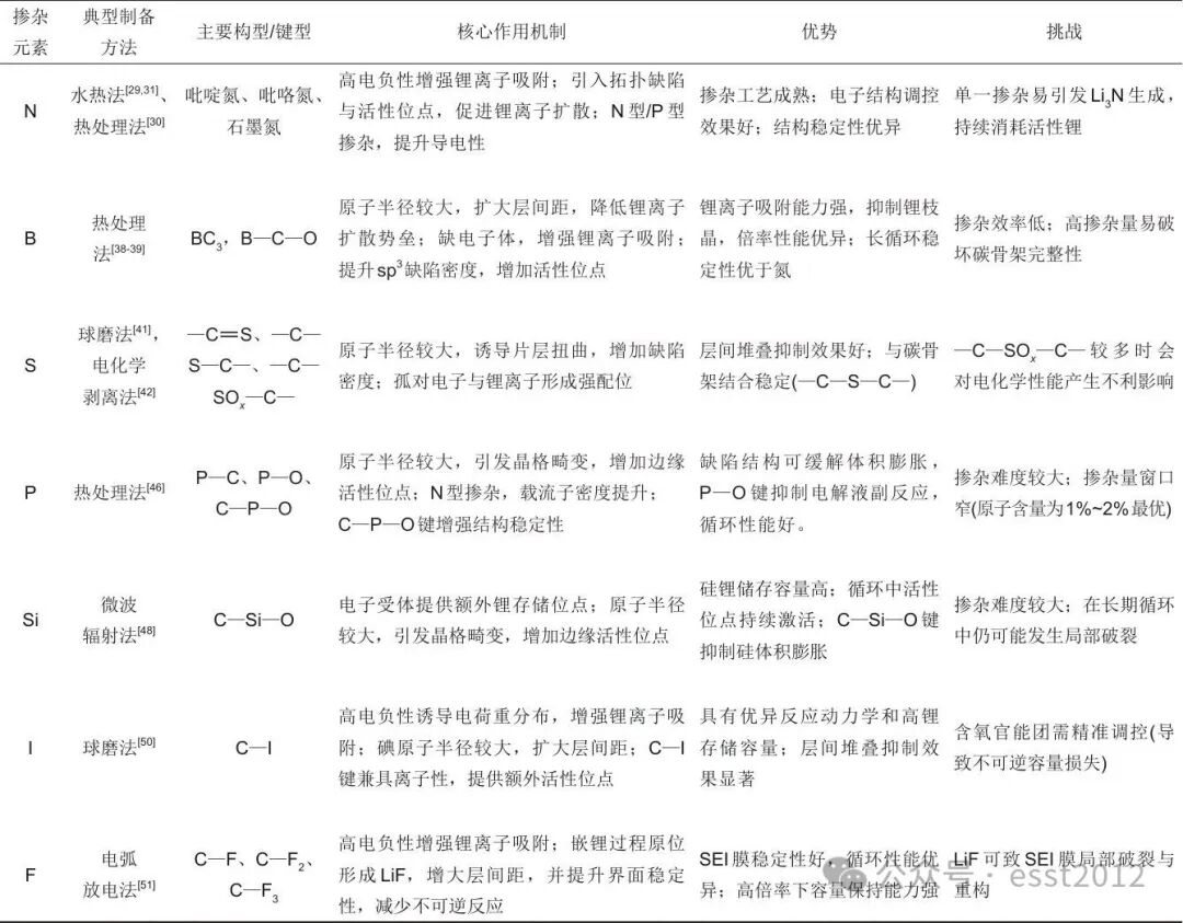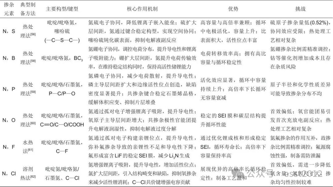 研究结果表明,杂原子掺杂效果主要受掺杂原子半径、电负性、元素组合、键合类型以及掺杂方式等因素的影响。石墨烯的杂原子掺杂根据掺杂元素数量的不同分为单掺杂和共掺杂。单掺杂因原子半径、电负性、键合类型等差异能引发石墨烯网络极化,有效改变石墨烯的电子能带结构,呈现N或P型掺杂,增强石墨烯与锂离子之间的相互作用、降低锂离子嵌入能垒并改善其电子导电性。同时掺杂引入的拓扑缺陷与储锂活性位点,原子半径差异和键合类型改变导致的晶格畸变等均可改善石墨烯的锂离子存储性能与传输动力学。不同掺杂方式会影响石墨烯介孔结构、掺杂位置、浓度、键合状态等,从而对石墨烯的结构、电子性质及锂离子存储性能等产生影响。为更直观地对比不同掺杂体系的基本特性,表1系统总结了单掺杂石墨烯体系的关键信息,具体涵盖典型制备方法、主要构型/键型、核心作用机制,以及各体系的优势与面临的挑战。