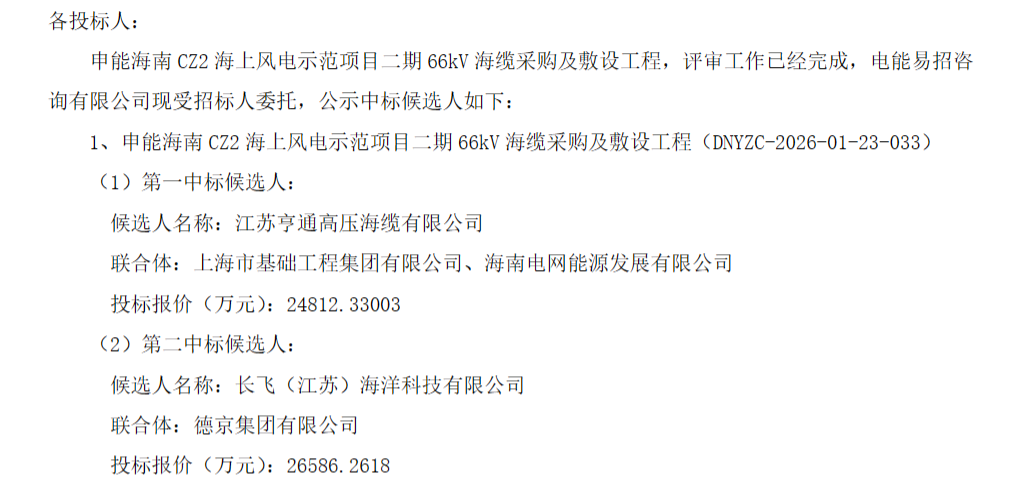 公告显示,第一中标候选人:江苏亨通高压海缆有限公司(联合体:上海市基础工程集团有限公司、海南电网能源发展有限公司),投标报价:24812.33003万元。第二中标候选人:长飞(江苏)海洋科技有限公司(联合体:德京集团有限公司),投标报价:26586.2618万元。