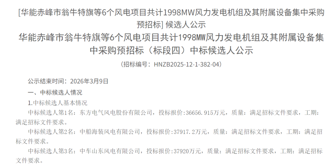 公告显示,第一中标候选人:东方风电,投标报价:36656.915万元。第二中标候选人:中船海装,投标报价:37917.2万元。第三中标候选人:中车山东风电,投标报价:37920万元。