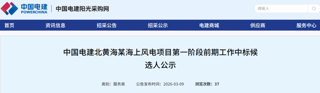 企业推荐网获悉,3月9日,中国电建阳光采购网发布《中国电建北黄海某海上风电项目第一阶段前期工作中标候选人公示》。