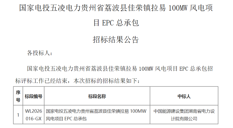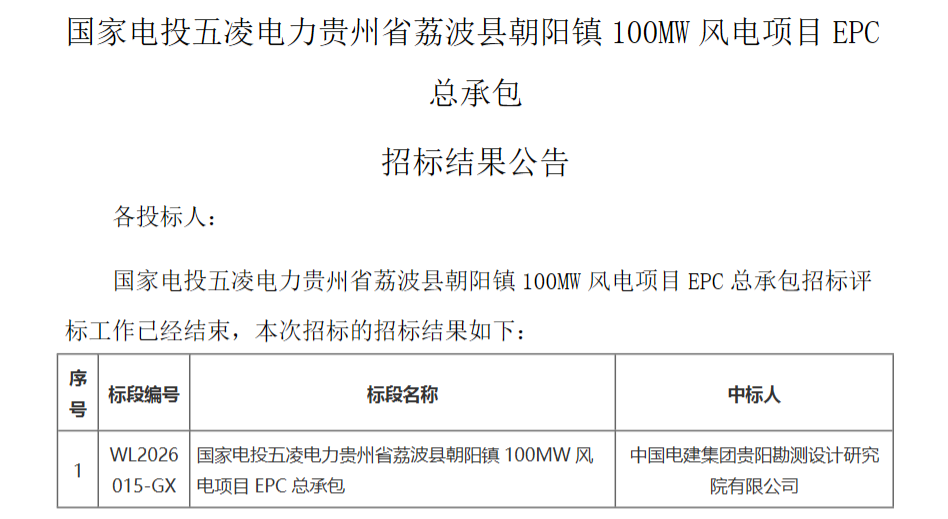 公告显示,国家电投五凌电力贵州省荔波县朝阳镇风电场中标人:中国电建集团贵阳勘测设计研究院有限公司,中标价格:36300.00万元。